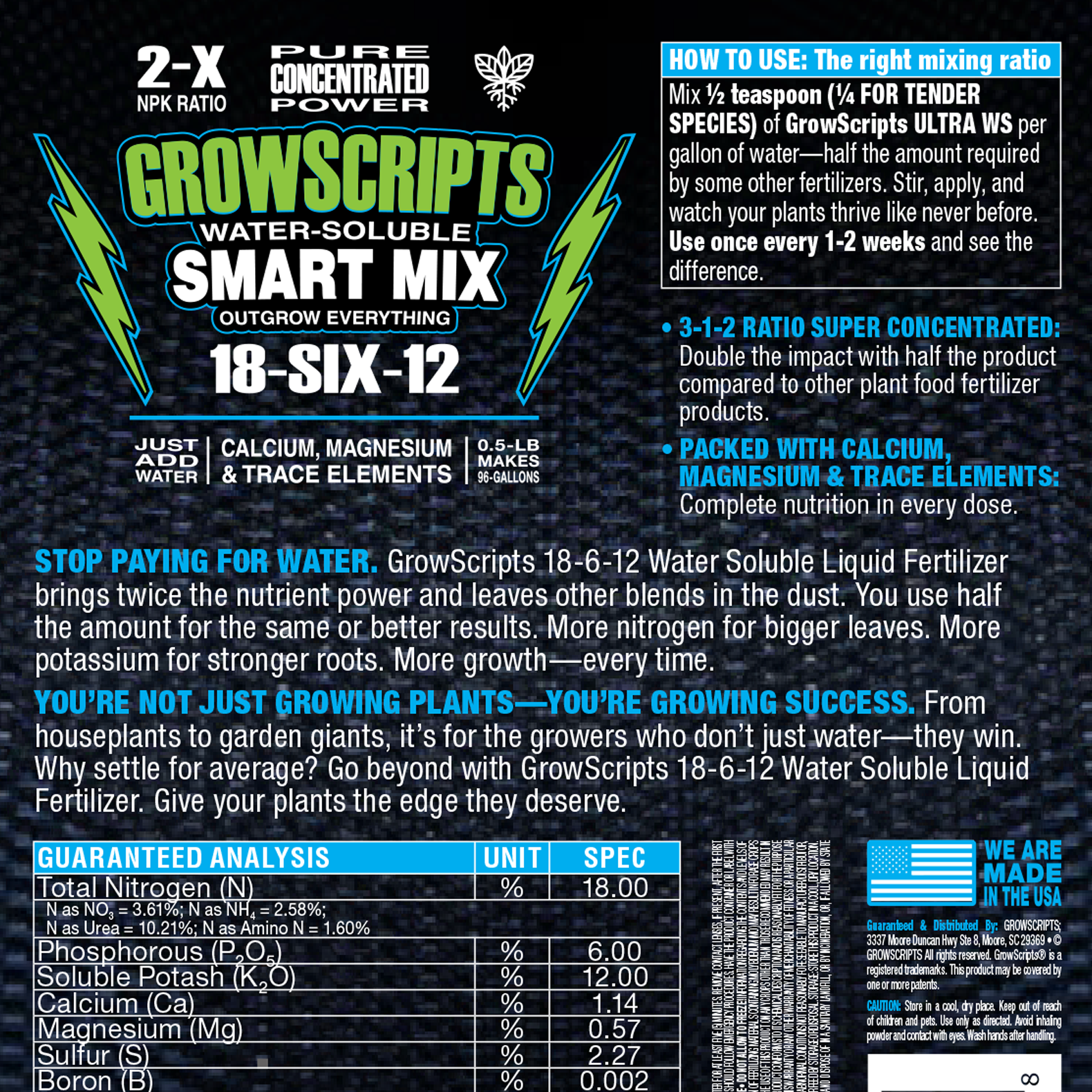 Each 0.5 lb package of GrowScripts ULTRA WS 18-6-12 contains 64 teaspoons (tsp.) of product. With the recommended application rate of just 1/2 teaspoon per gallon of water—which is half the amount typically recommended by other products—this package makes a total of 128 gallons of ready-to-use solution. That means you’re getting double the coverage with each package, making it a cost-effective and efficient way to feed your plants while ensuring they receive the balanced nutrition they need.